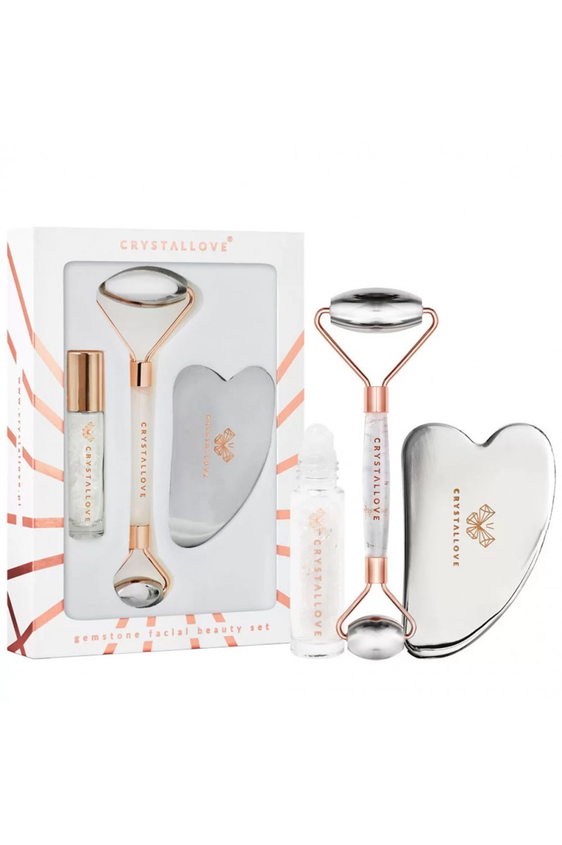 Zestaw do masażu twarzy bazuje na najlepszych naturalnych produktach zapewniających wyjątkową atmosferę domowego SPA. Składa się z 2 głównych produktów marki: rollera do twarzy oraz płytki do masażu twarzy gua sha. Zestaw został wzbogacony o szklaną buteleczke na olejki, która zawiera kulkową końcówkę masującą wykonaną z kryształu górskiego, wewnątrz znajdują się kryształy dzięki czemu Twój olejek zostanie nasycony cenną energią kamienia. Zestaw prezentuje się przepięknie dlatego jest również idealnym pomysłem na prezent.