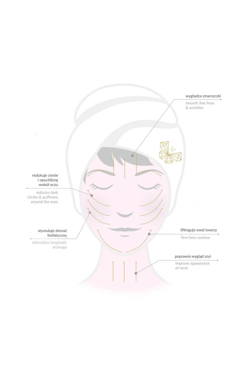 Masaż wykonujemy na oczyszczonej skórze pokrytej ulubionym olejkiem lub serum tak aby płytka bez trudu przesuwała się po skórze. Wykonujemy ruchy od wewnętrznej do zewnętrznej strony twarzy, wg instrukcji dołączonej do opakowania.