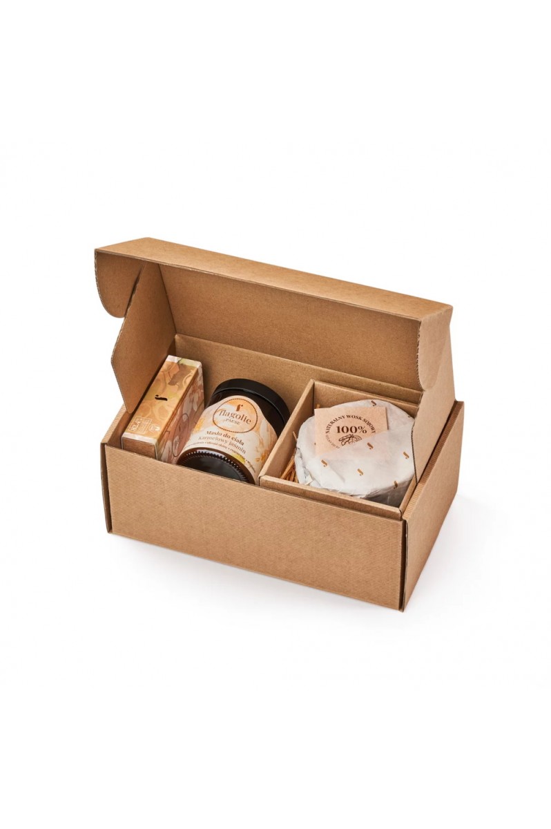 Zestaw prezentowy składa się z pełnowymiarowej świecy sojowej do wnętrz Jaśmin i Karmel (170 g), naturalnego masła do ciała Karmelowy Jaśmin oraz wegańskiego mydełka na bazie gliceryny. Podczas tworzenia produktów korzystamy z polskich surowców i wspieramy polskich rzemieślników. Dbamy o jakość. Wszystko wykonujemy ręcznie. Każdy zestaw pakujemy w ozdobne kartonowe pudełko z naszym logo. Staramy się, żeby jego wygląd sprostał Twoim oczekiwaniom! To idealny upominek na różne okazje oraz doskonały podarunek dla bliskiej osoby. Oczywiście, nic nie stoi na przeszkodzie, żeby sprawić pachnący prezent samemu sobie.
