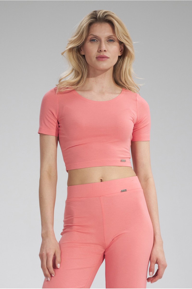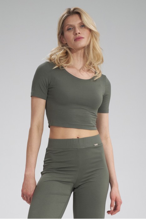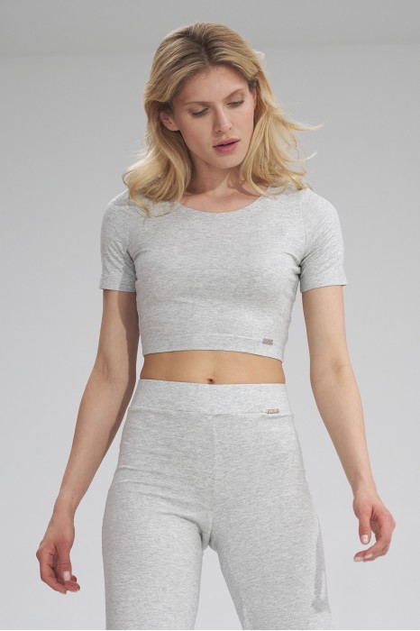 Crop top ma krótkie rękawy i delikatny dekolt w łódkę, który wysmukla szyję i podkreśla dekolt.