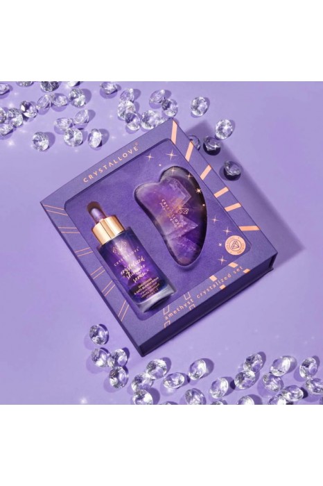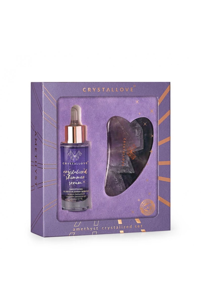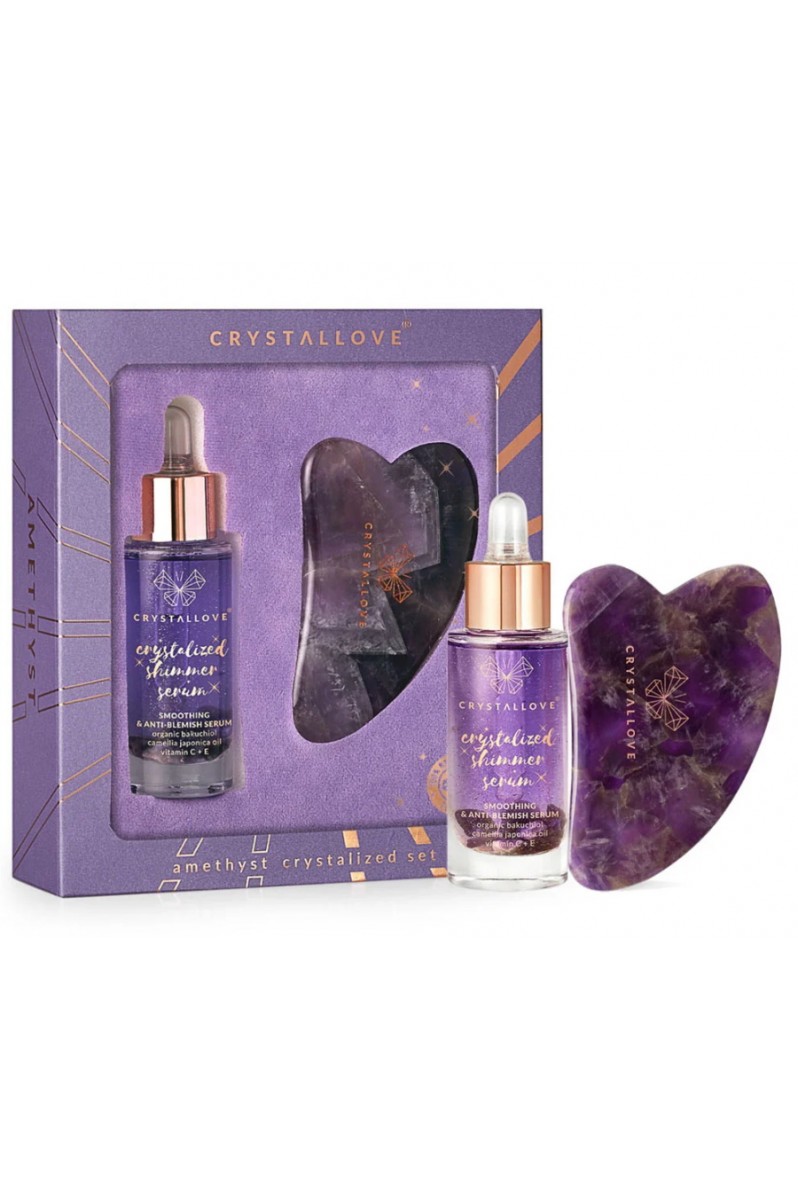 Zestaw do masażu twarzy w skład którego wchodzi wygładzające, rozjaśniające i regenerujące serum do twarzy, szyi i dekoltu nasycone ametystem. Wzbogacone pięknie pachnącymi olejkami i wypełnione naturalnymi antyoksydantami.