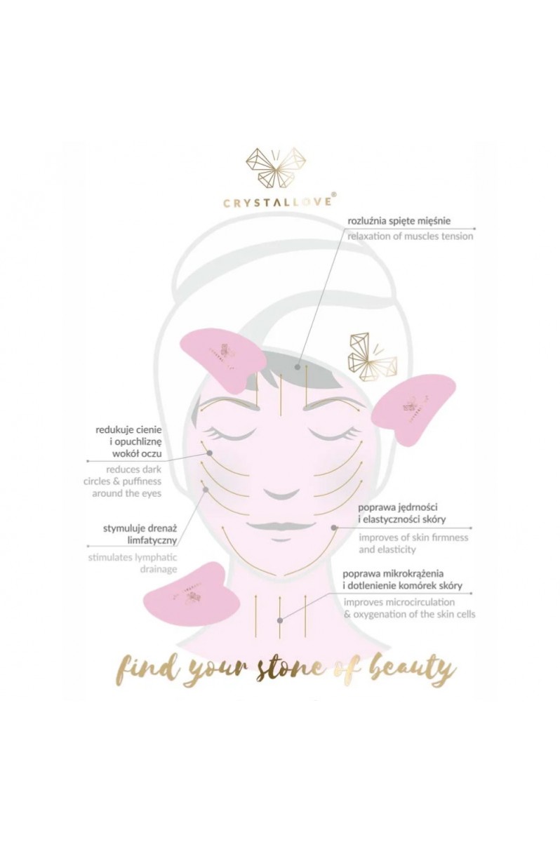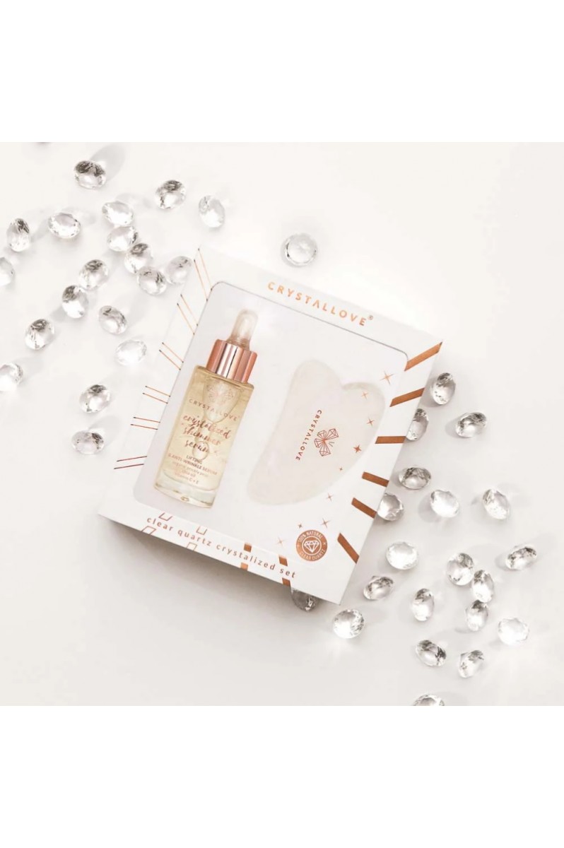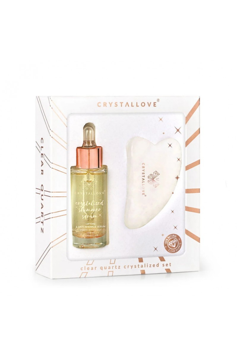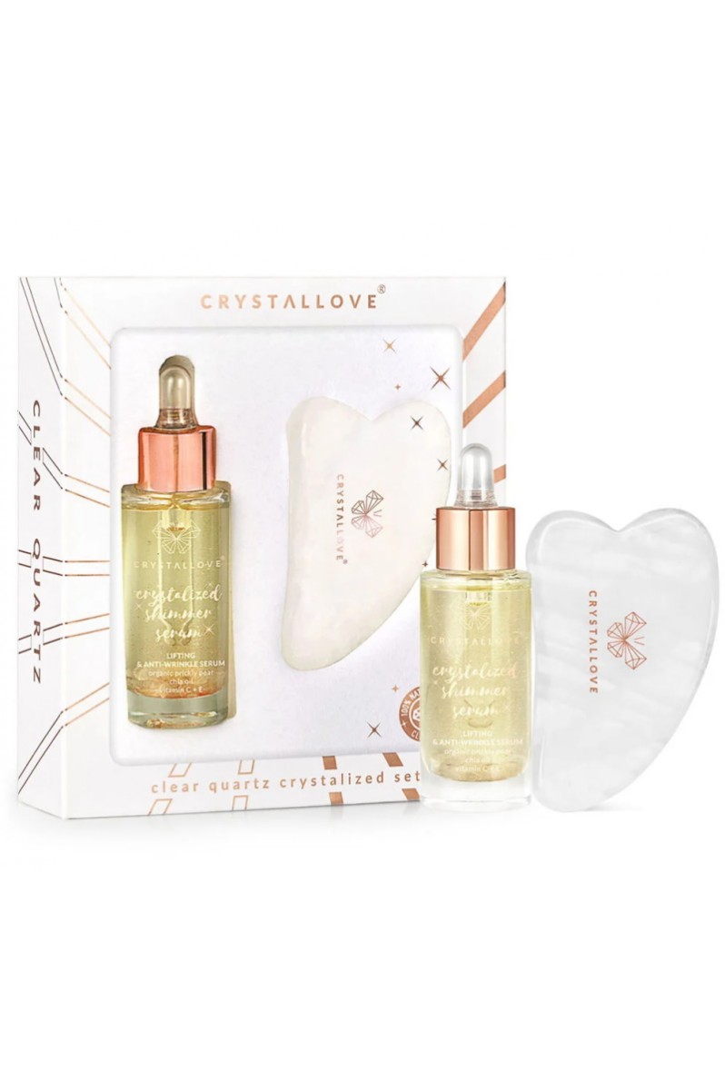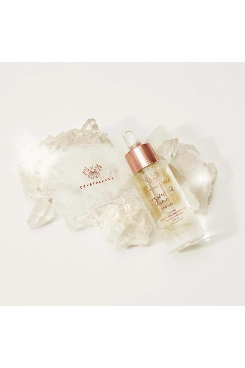 Zestaw do masażu twarzy, w skład którego wchodzi liftingujące, rozjaśniające i ujędrniające serum do twarzy, szyi i dekoltu nasycone kryształem górskim. Wzbogacone o sprawdzone składniki i pięknie pachnące olejki. Wegańskie. Polecane do każdego typu skóry, zwłaszcza z widocznymi zmarszczkami, matowej i zmęczonej. Serum zawiera naturalne kamienie kryształu górskiego, uważanego za kamień o najsilniejszych właściwościach oczyszczających. Do zestawu dołączona jest płytka do masażu twarzy gua sha wykonana również z kryształu górskiego.