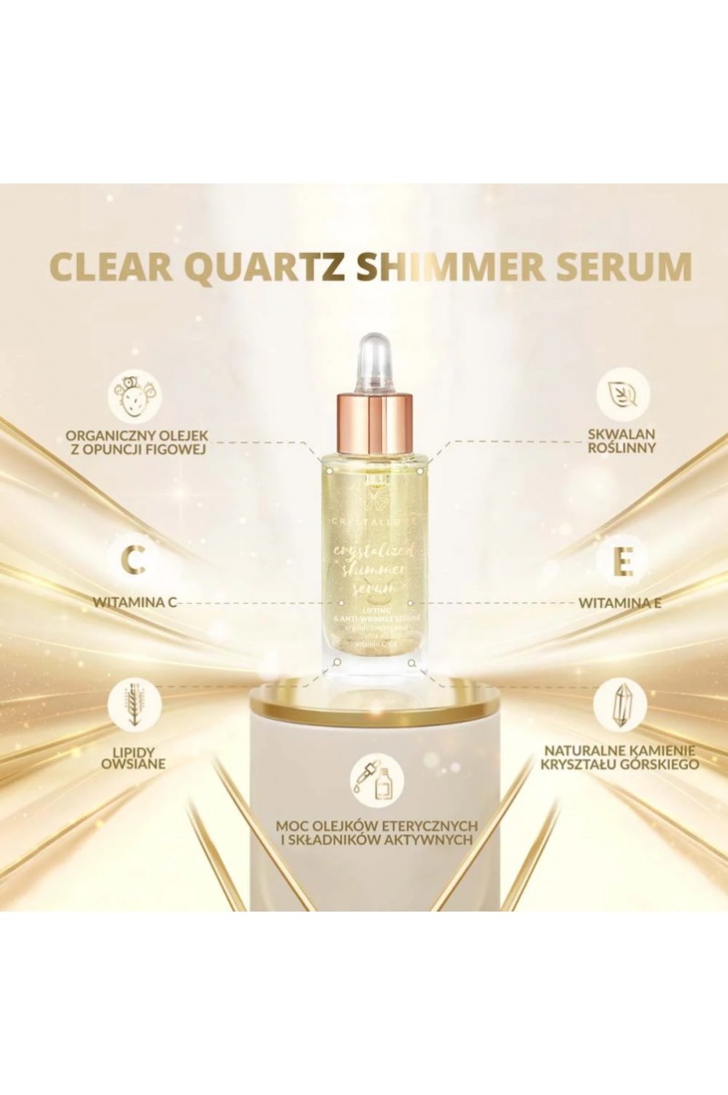 Serum do twarzy, szyi i dekoltu z kryształem górskim, o bogatej formule, zawierające w swoim składzie ponad 10 sprawdzonych i starannie wyselekcjonowanych składników sprawi że Twoja cera stanie się rozświetlona i pełna blasku. Zaprojektowane z myślą o każdym rodzaju skóry, idealne zwłaszcza dla cery z widocznymi zmarszczkami, matowej i zmęczonej. Każda luksusowa kropla serum nasyci Twoją skórę cennymi olejkami roślinnymi, bogatymi w kwasy omega i ekstraktami. Dostarczy skórze dawkę przeciwutleniaczy i witamin. Dodatek naturalnych minerałów takich jak mieniąca się mika oraz kryształ górski nie tylko wzbogaca formułę serum i czyni go wyjątkowym ale także, wg medycyny naturalnej, kryształ górski posiada szereg właściwości, które działają korzystnie na cerę. Kryształ górski to zdecydowanie najsilniejszy kamień oczyszczający.